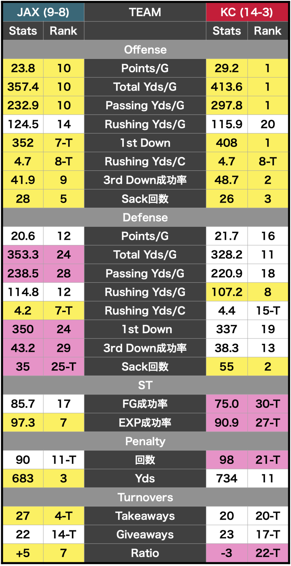 相手がもしJAXに対して油断してくれるのであればそこが勝機になると思うのですが、さすがにHCはAndy Reidですし、プレーオフであることを考えると期待はできなさそうです。分があるとすれば相手はプレーオフ初戦で試合から間が空いているのに対してこちらは歴史的な逆転劇でかなり調子に乗っている、というところでしょうか。勢いが試合中も続くようなら可能性はあるかもしれません。あと心配なのはKCのホームは非常にうるさいらしい、ということ。あのSEAと同等くらいらしいですね。それによってミスコミュニケーションが生まれないことを願います。
