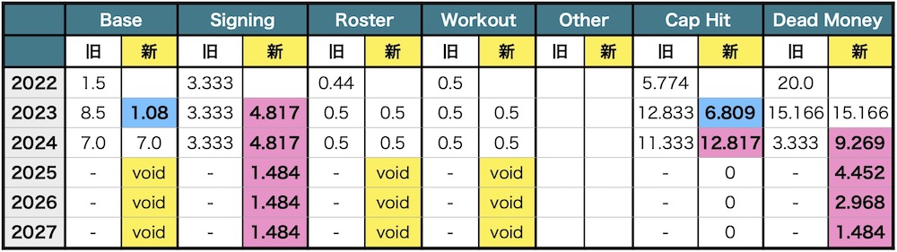 2023年のベースサラリー8.5Mのうち7.42Mを2023年から5年間で分割し1.484M/yrがサインボーナスに追加されています。